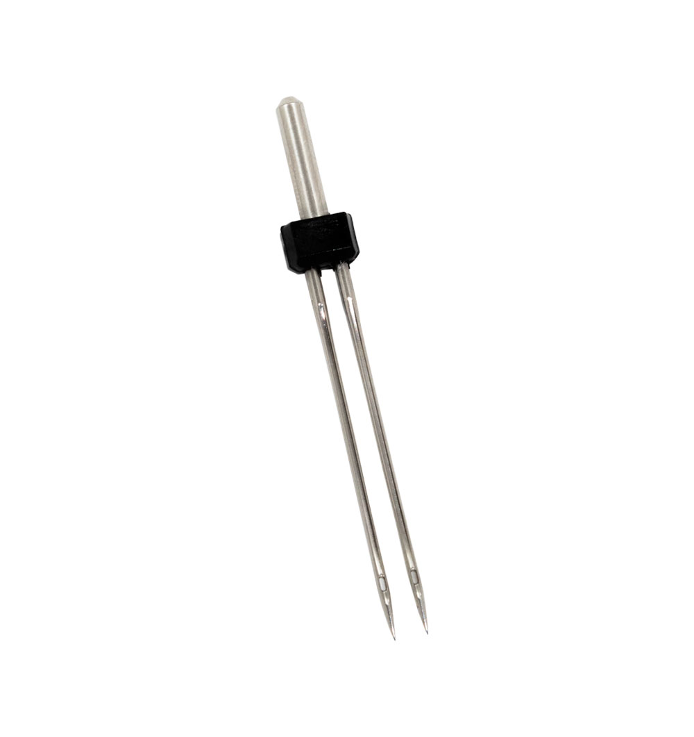 A agulha dupla possui tamanho 11 e espaçamento de 2mm entre as agulhas, geralmente indicada para costura de tecidos leves.
