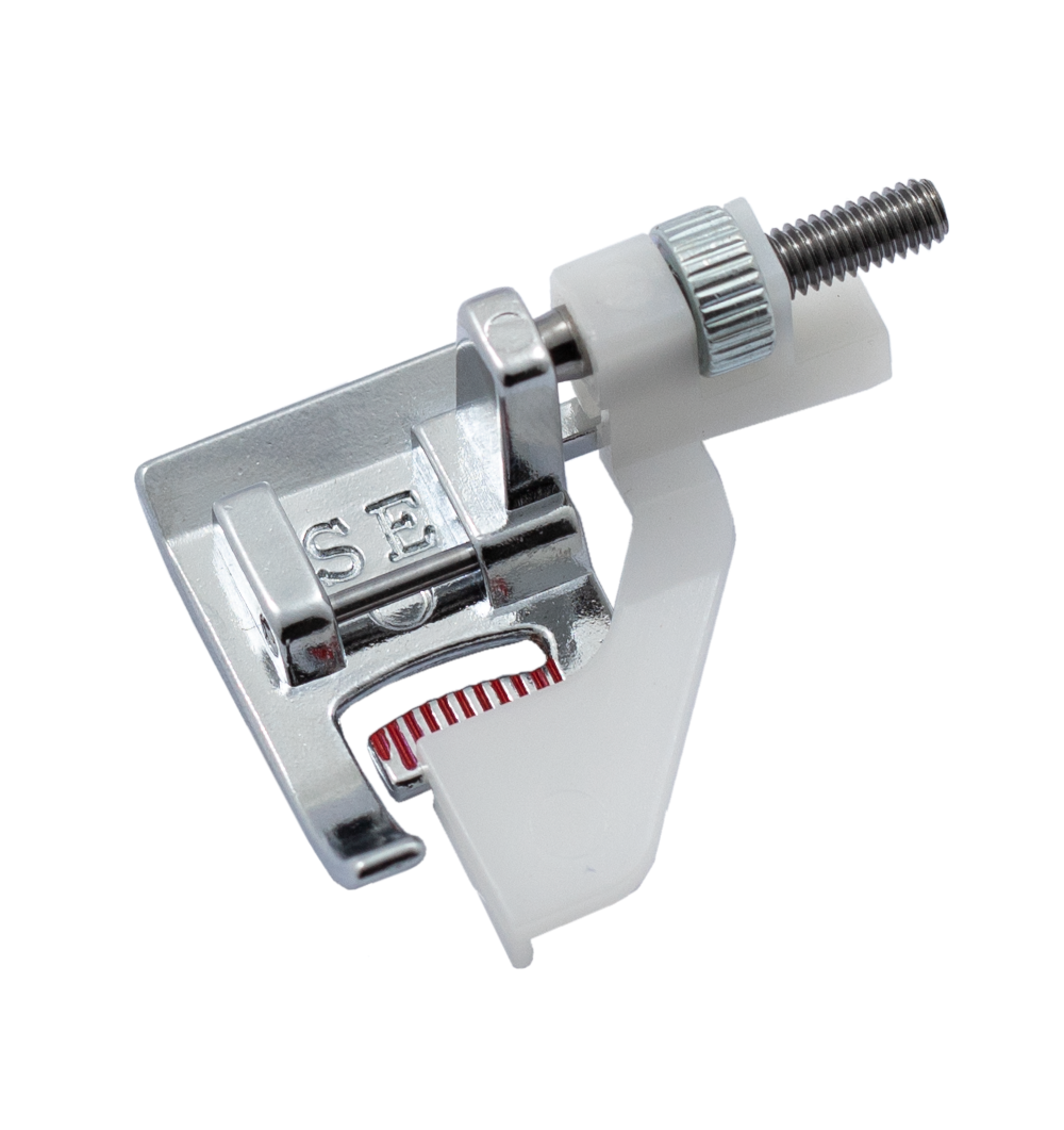 Calcador desenvolvido para facilitar o alinhamento das bordas/bainhas do tecido para realização de costura paralela e pesponto.
