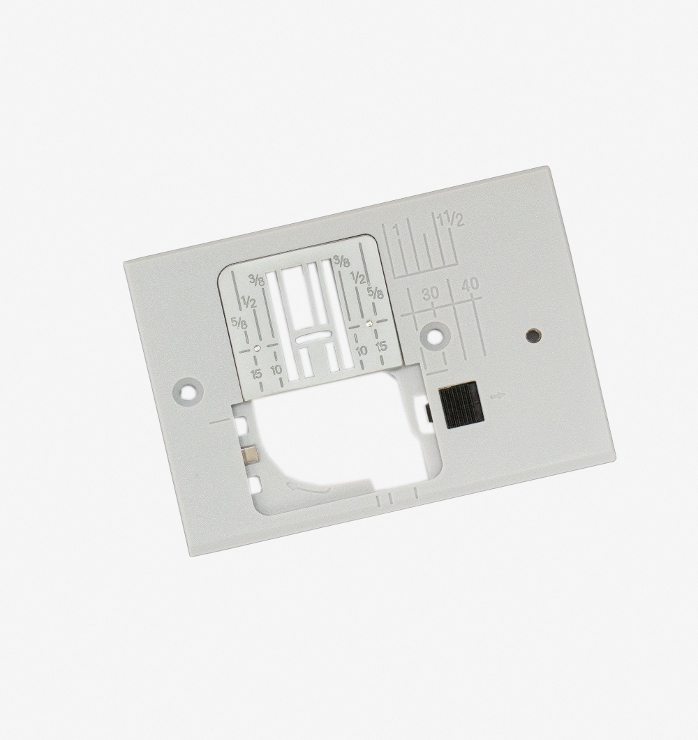Chapa de agulha com marcações de medidas que auxiliam a guiar a costura.