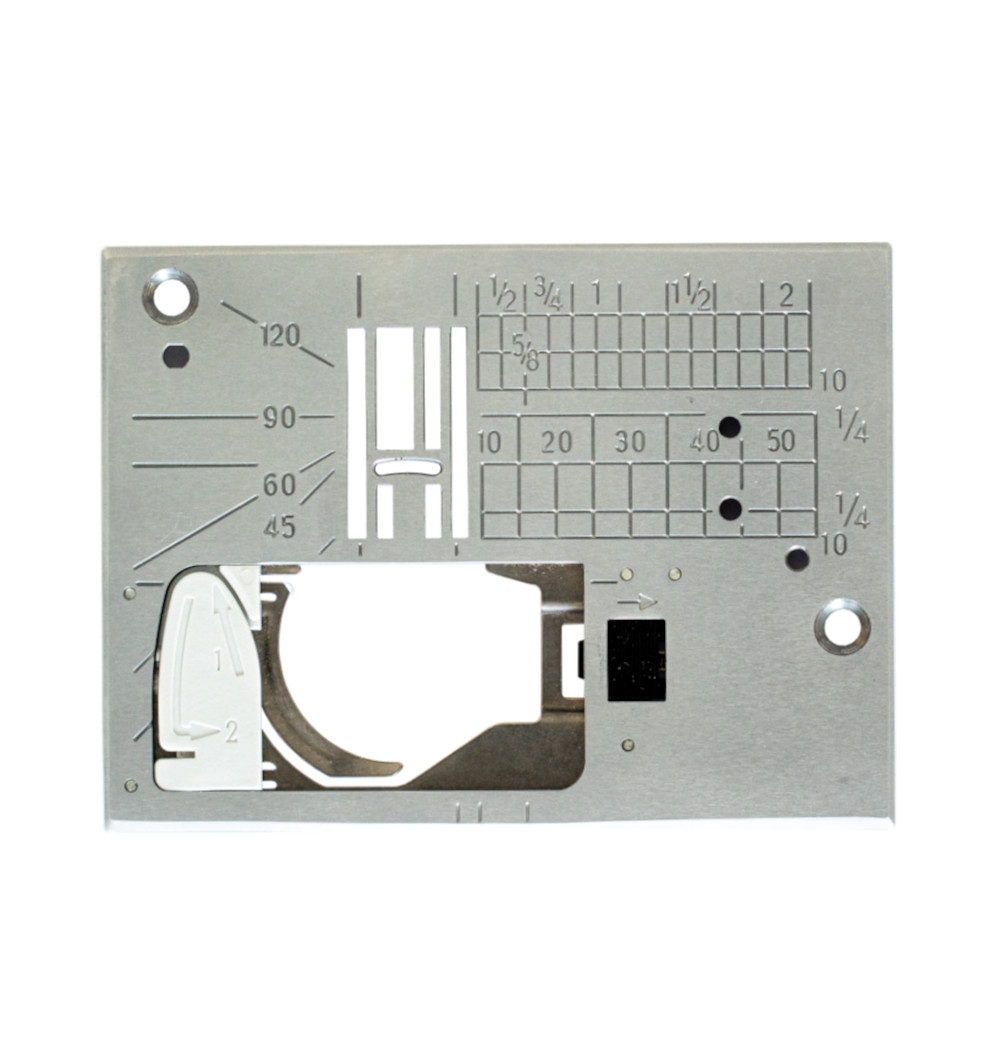 Chapa de agulha com marcações de medidas que auxiliam a guiar a costura.