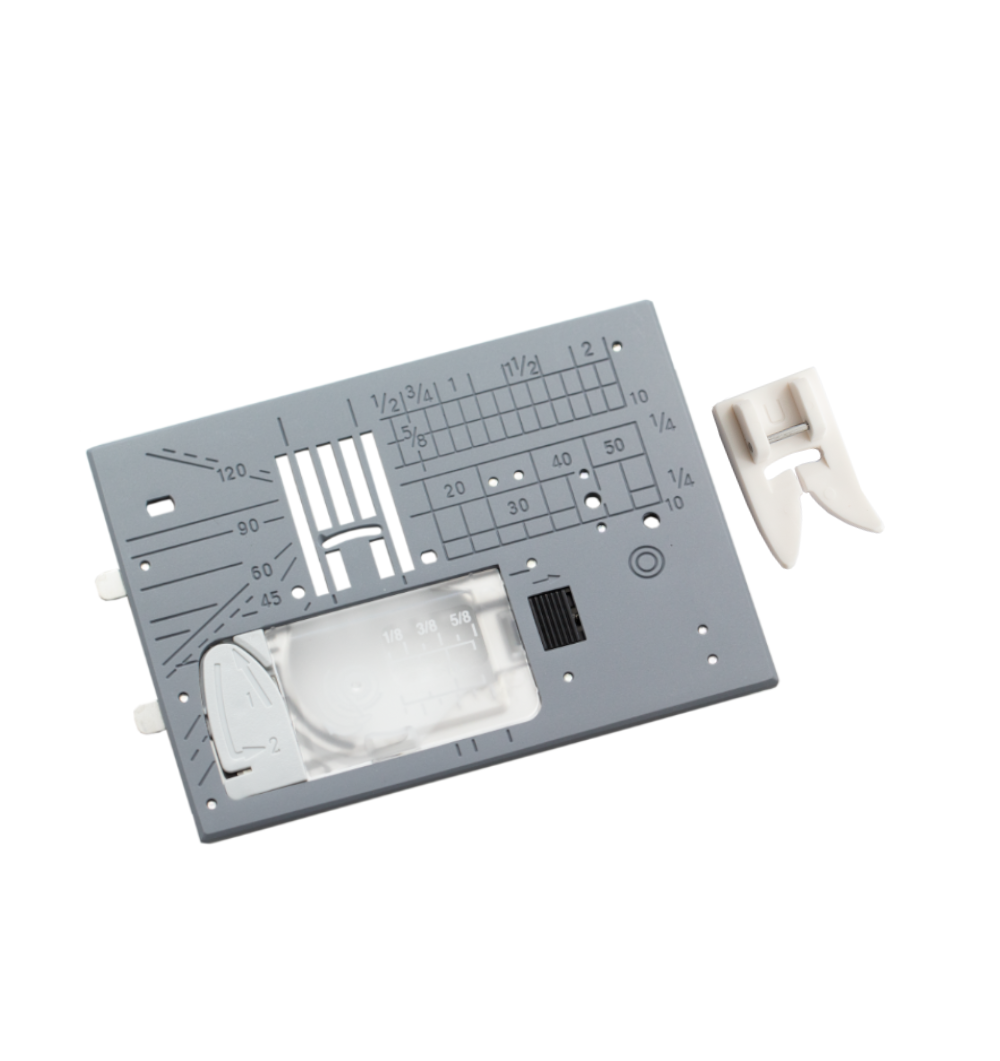 | Dimensões aproximadas da peça | Calcador ultradeslizante – Largura 2,0 cm x Altura 0,7 cm x Profundidade 3,0 cm, Chapa de agulha ultradeslizante – Largura 10,7 cm x Altura 1,0 cm x Profundidade 8,0 cm |