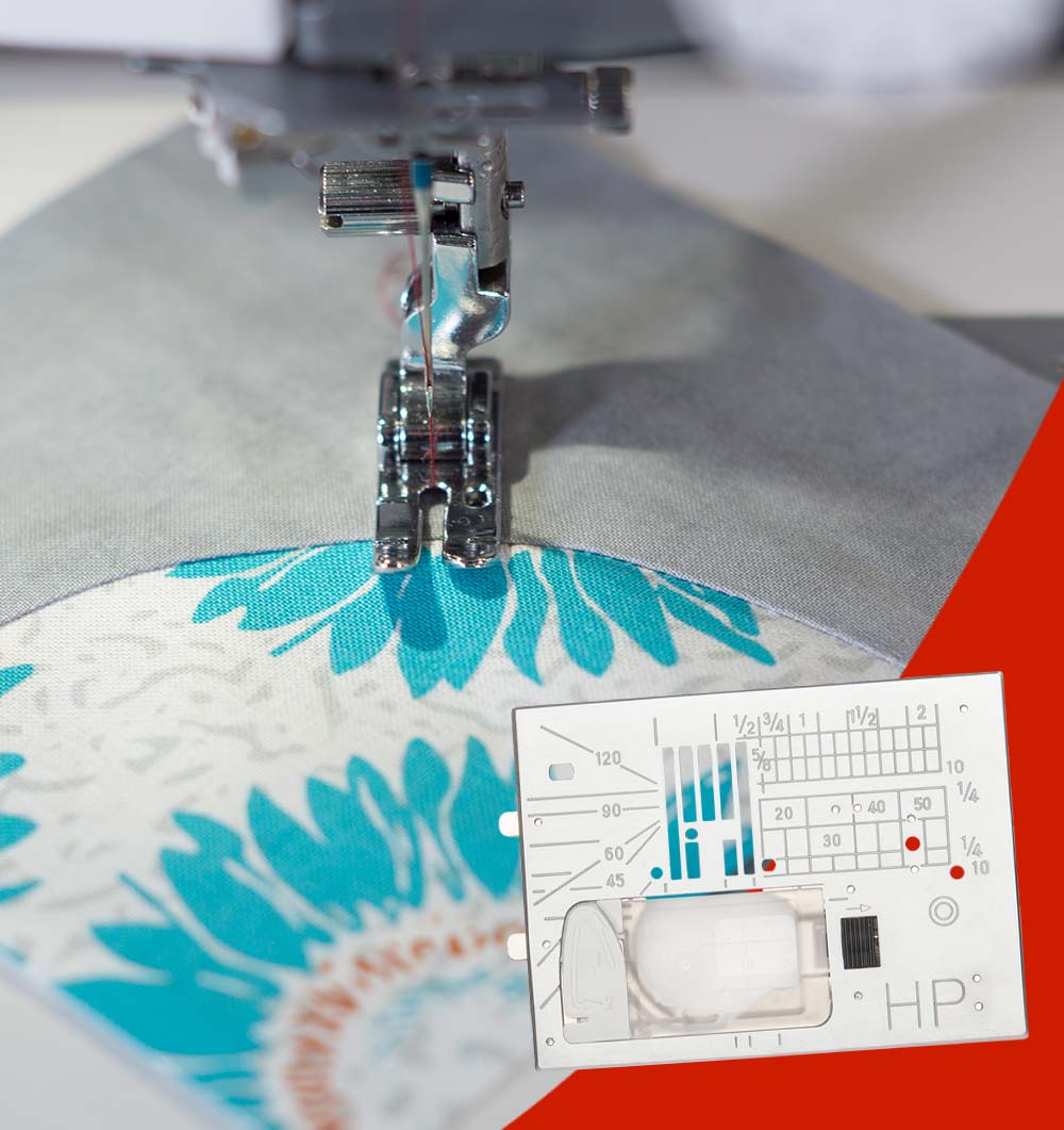 Chapa de agulha com marcações de medidas que auxiliam a guiar a costura.