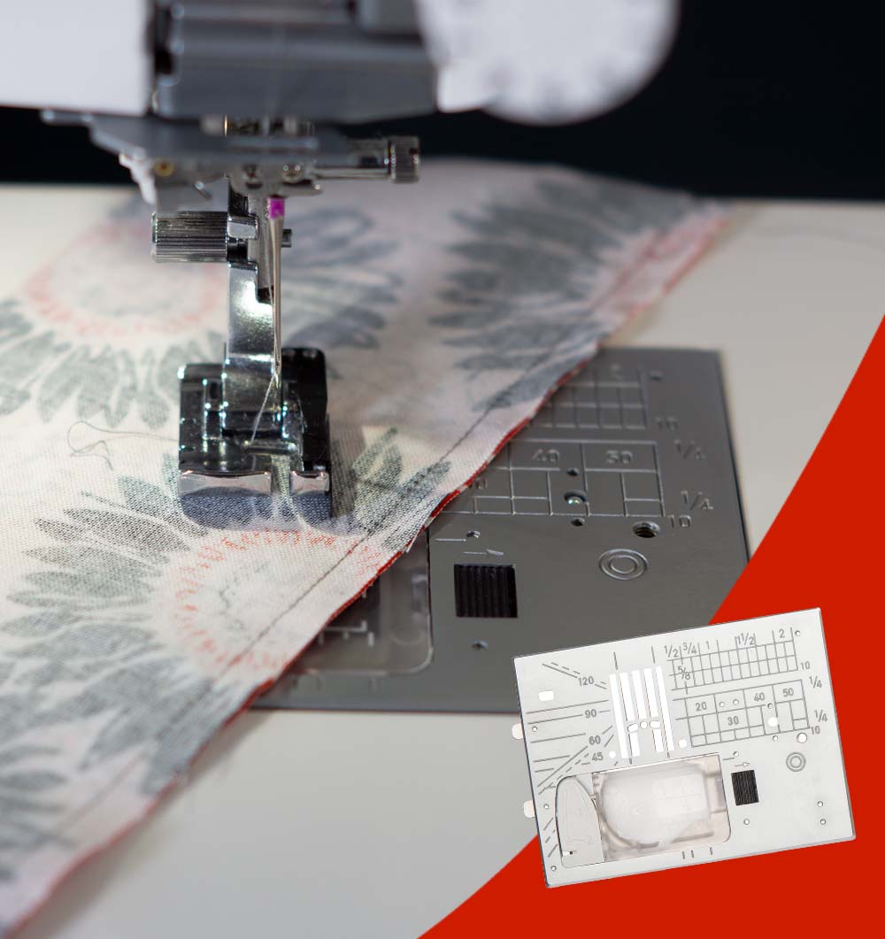 Chapa de agulha com marcações de medidas que auxiliam a guiar a costura.