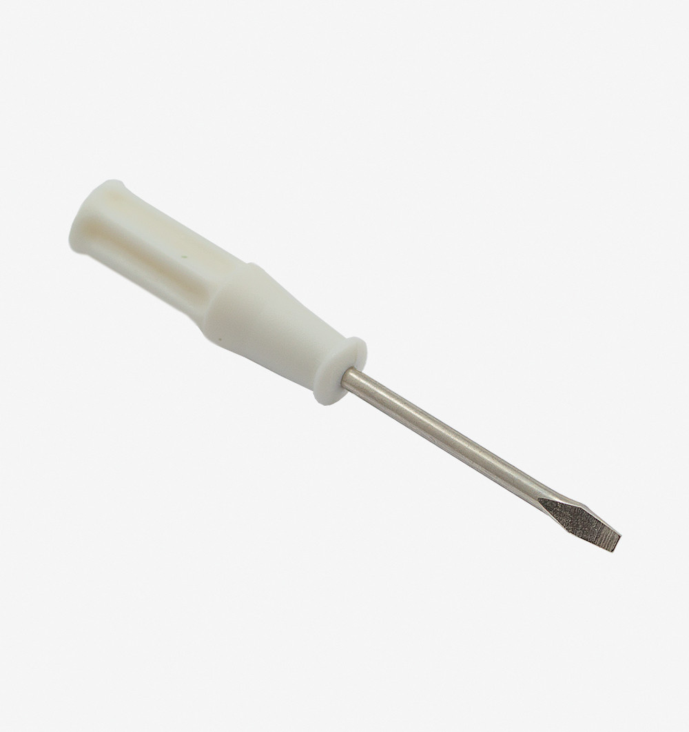 A chave de fenda branca da Janome foi especialmente desenvolvida para ajustes no parafuso da caixa da bobina e também para trocar a agulha nas máquinas galoneiras e overlock.