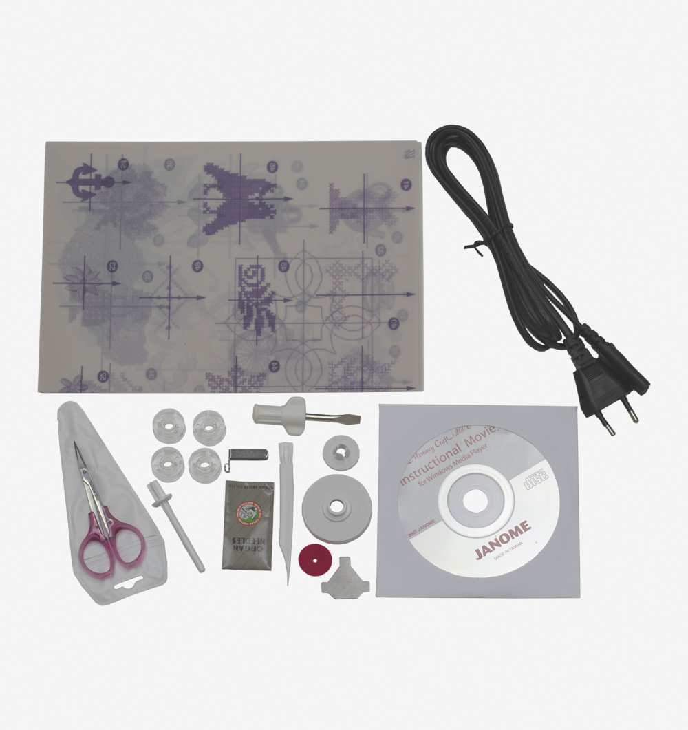 - Kit de acessórios padrão com: 4 bobinas, 1 feltro, 1 escova de limpeza, 1 chave de fenda branca, 1 tesoura, 1 pino do carretel adicional, 1 suporte do carretel especial, 1 porta carretel grande, 1 porta carretel pequeno, 1 chave de fenda e 1 conjunto de agulhas, 1 CD de instruções de manejo, 1 bastidor 14×14 cm com gabarito, gabarito em papel, 1 guia linha e 1 cabo de energia.
