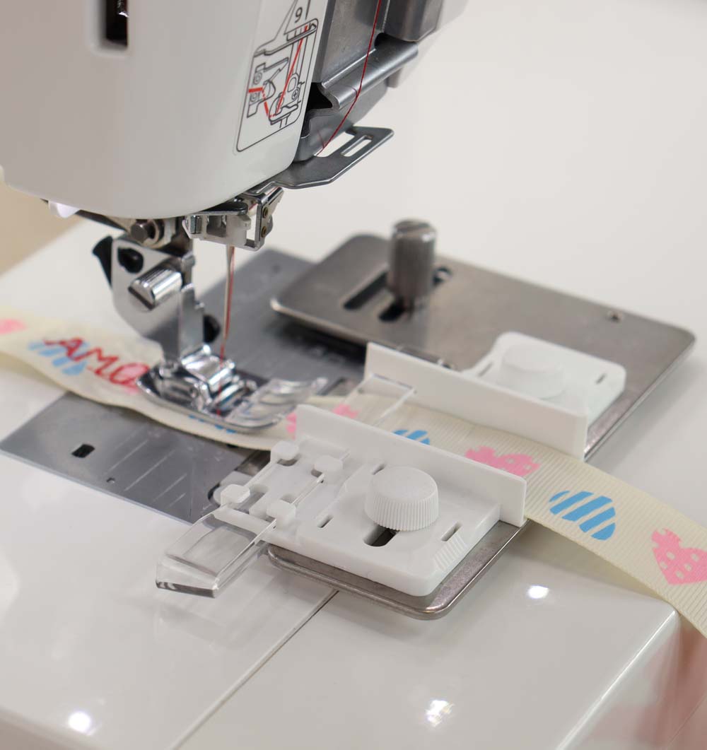 A grande vantagem do Guia de Costura para Fitas Janome é a simplicidade de uso e instalação. Se sua máquina possui um furo roscado na chapa da agulha ou na base da máquina, você pode usar este acessório divertido. É muito fácil ajustar o guia para fitas de 6 mm (¼”) até 25 mm (1”), pois ele é totalmente regulável e mantém a fita firme enquanto você costura.'
